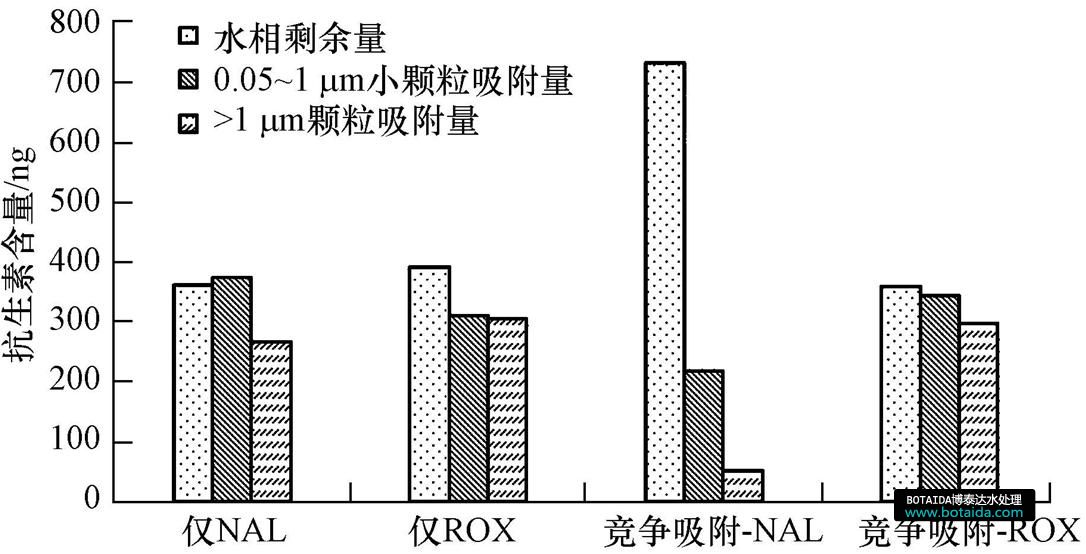 有研究發(fā)現(xiàn),不同粒徑的顆粒物在天然水體中的分布不同,對抗生素的吸附能力也不同.一方面,水體中小顆粒物(粒徑<1 μm)的百分含量較高,加之其廣大的比表面積,會大量吸附水體中殘留的抗生素,然而傳統(tǒng)飲用水處理標準中卻沒有針對小顆粒物去除效果的相關(guān)標準;另一方面,粒徑越小,顆粒物越難以去除,其表面吸附的抗生素也會隨之殘留在水體中,對飲用水安全產(chǎn)生影響.基于此,本文進行了天然水體顆粒物對4種典型抗生素(羅紅霉素(ROX)、青霉素G(PG)、甲氧芐啶(TMP)、萘啶酸(NAL))的吸附平衡實驗,研究它們兩兩之間的競爭吸附特征,并分粒徑測定不同大小顆粒物上的抗生素含量,以期對飲用水水質(zhì)標準和處理工藝的改善提供借鑒.