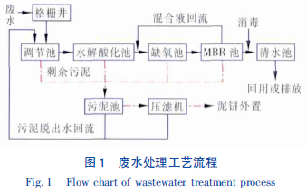 制藥工業(yè)廢水通常都屬于較難處理的高濃度有機(jī)廢水之一,其水質(zhì)隨生產(chǎn)工藝不同而差異較大。本項(xiàng)目中雖然實(shí)驗(yàn)室廢水水量較小,但其與生活污水混合后仍然表現(xiàn)出較高的污染特性,可生化性較差,且SS、糞大腸菌群數(shù)較高。在制藥工業(yè)廢水的生化處理工藝方面,報(bào)道較多的是采用SBR 工藝,但其出水水質(zhì)受沉淀池停留時(shí)間和潷水器操作等影響較大、剩余污泥處理費(fèi)用較高、對(duì)管理人員的技術(shù)能力要求較高。由于本項(xiàng)目水量不大,不宜采用多個(gè)SBR 反應(yīng)器。但采用單一SBR 反應(yīng)器需要較大的調(diào)節(jié)池,大大增加了占地面積和投資費(fèi)用。業(yè)主要求充分利用有限土地資源,最大限度地降低對(duì)環(huán)境的污染。因此,綜合考慮采用MBR 工藝作為生化處理的核心工藝,膜組件選用雙疊式大面積平板膜組件,有效提高膜的穩(wěn)定性和抗污染能力。廢水處理工藝流程見(jiàn)圖1。