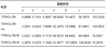 通過(guò)XRD分析軟件(X′Pert highscore plus)對(duì)數(shù)據(jù)進(jìn)行分析(晉勇等,2008)得到各電極的晶胞參數(shù)見(jiàn)表 1,分析表中數(shù)據(jù)發(fā)現(xiàn),對(duì)Ti/SnO2-Sb電極進(jìn)行金屬摻雜改性后,晶胞參數(shù)發(fā)生改變,主要體現(xiàn)在晶胞體積的增大或減小,這是由于各金屬離子成鍵半徑不同,當(dāng)金屬離子以固溶或者類質(zhì)同相的形式取代Sn4+進(jìn)入SnO2晶格內(nèi)部,必然引起金屬氧鍵的鍵長(zhǎng)發(fā)生變化,從而造成晶胞參數(shù)的改變.XRD圖譜和晶胞參數(shù)等數(shù)據(jù)表明,通過(guò)金屬摻雜改性使金屬離子進(jìn)入到SnO2晶格中,其中,Cu和Ni以其p型半導(dǎo)體的性質(zhì)形成了空穴點(diǎn)位(劉淼等,2013),使電極表面形成較為密集的蜂窩狀,微觀結(jié)構(gòu)(圖 1)中也觀察到電極無(wú)裂縫且蜂窩狀結(jié)構(gòu)分布均勻,這樣的結(jié)構(gòu)可以增加電極的活性點(diǎn)位而提高電催化性能;而B(niǎo)i則為n型半導(dǎo)體,與SnO2有著相似的性質(zhì),進(jìn)入SnO2晶格后主要通過(guò)增加自由電子的濃度來(lái)達(dá)到增強(qiáng)導(dǎo)電能力的效果.