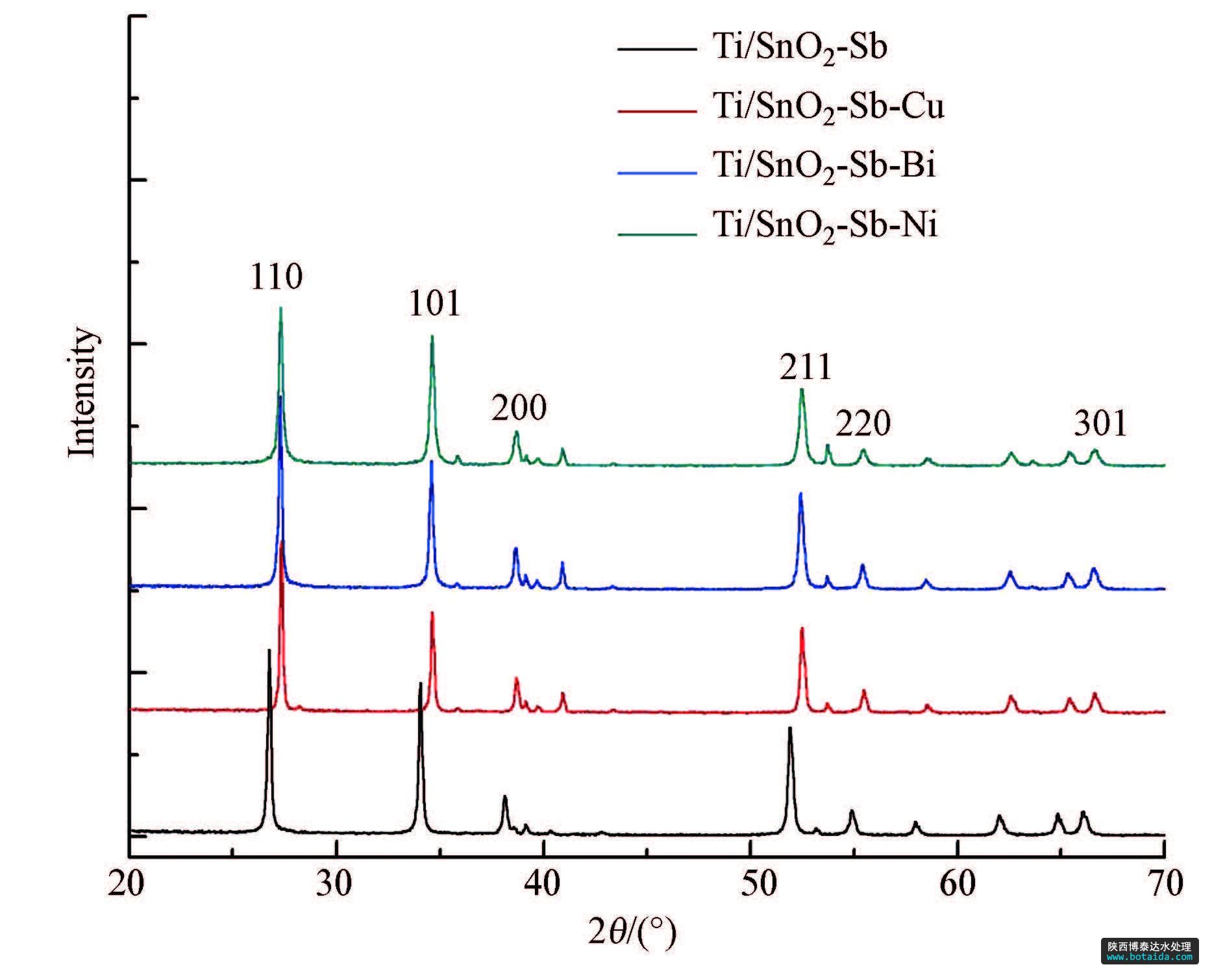 同時(shí)從所有電極的XRD圖譜中也沒(méi)有發(fā)現(xiàn)有鈦基體的特征峰出現(xiàn),說(shuō)明所制備電極的表面已經(jīng) 完全被二氧化錫微粒所覆蓋.這樣的結(jié)構(gòu)避免電解 過(guò)程中產(chǎn)生的氧滲透到鈦基體,改變其界面的張力,造成活性涂層的脫落,影響電極的催化活性.