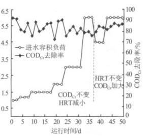 經(jīng)過近 40 d 的培養(yǎng)馴化,當(dāng)進(jìn)水 CODCr 為 1 100 mg/L,HRT 為 24 h 時 ,CODCr 去 除 率 穩(wěn) 定 在 92% 左右,進(jìn)入運(yùn)行特性試驗階段,該過程分 2 個階段提高進(jìn)水容積負(fù)荷 。 CODCr 去除率隨進(jìn)水容積 負(fù)荷的變化情況見圖 2。