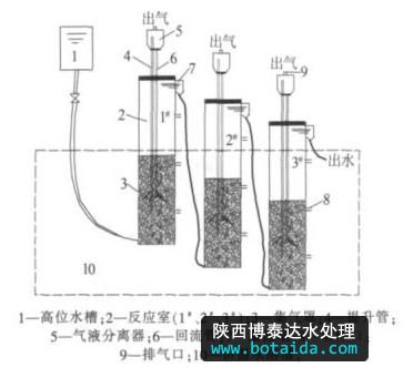 試驗裝置如圖 1 所示 ,MICR 由 3 根 D 80 mm× 1 000 mm 的有機(jī)玻璃管串聯(lián)而成,總有效容積為 12.81 L,分為 1#、2#、3# 反應(yīng)室。各反應(yīng)室均設(shè) 3 個孔徑為 8 mm 的取樣口,取樣口分別位于距離 反應(yīng)室底部 100、350、700 mm 處,并用恒溫水浴槽控制試驗溫度為(35±1 ) ℃。 廢水從高位槽向 1# 反應(yīng)室底部注入,然后由上部出水口經(jīng)溢流堰順管道進(jìn)入 2# 反應(yīng)室底部,依次推進(jìn),經(jīng)過 3# 反應(yīng)室之后排出 。各反應(yīng)室的氣體在集氣罩下方匯集,以泥水混合液的形式經(jīng)提升管進(jìn)入氣液分離器,氣體從排氣口排出,泥水混合液經(jīng)回流管回流至反應(yīng)室底部,形成液體內(nèi)部循環(huán) 。
