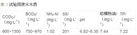 試驗所用乳品廢水取自廣西皇氏甲天下乳業(yè)股份有限公司 ( 主要水質(zhì)參數(shù)見表 1 ),并根據(jù)需要添加了適量純牛奶,以提高 CODCr,以尿素為氮源 、磷酸二氫鉀為磷源,保持 m (CODCr) ∶ m (N) ∶ m (P) = 300 ∶5∶1 。為促進(jìn)污泥馴化,適量添加含有 Fe、Ca、 Mn、Zn、Co、K 等微量元素的營養(yǎng)液。
