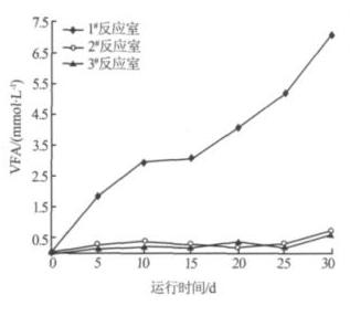 在厭氧消化過程中 ,甲烷菌主要利用 VFA 形成甲烷,因此 VFA 的積累程度及變化規(guī)律能夠很好地表征厭氧反應(yīng)器的相分離狀態(tài)〔6〕。圖 5 為各反應(yīng)室出水的 VFA 隨運(yùn)行時間的變化情況。