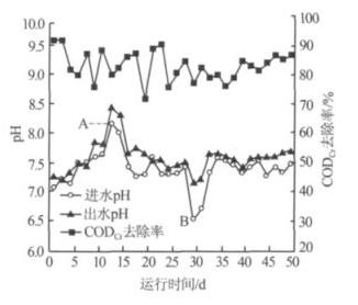 圖 3 進(jìn)、出水 pH 及 CODCr 去除率隨運(yùn)行時間的變化