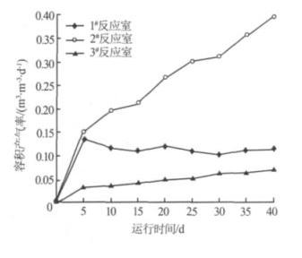 由圖 6 可見,2# 反應(yīng)室產(chǎn)生的 CH4 最多,容積產(chǎn)氣率 >0.153 m3/(m3· d),最高達(dá) 0.397 m3/(m3· d),并隨著容積負(fù)荷的 增加而增大 ( 隨運(yùn)行時間延長容積負(fù)荷增加 ),表明 2# 反應(yīng)室以產(chǎn)甲烷菌為主。 1# 反應(yīng)室產(chǎn)生的 CH4 量受進(jìn)水容積負(fù) 荷的影響不大 ,總體保持在 0.103~ 0.137 m3/(m3· d) 的水平 ,表明 1# 反應(yīng)室主要起水解和酸化作用 ,以產(chǎn)酸菌為主,產(chǎn)甲烷菌的活性受到抑制 ,而且受進(jìn)水容積負(fù)荷的直接沖擊,CH4 產(chǎn)量呈現(xiàn)小幅度的波動 。 3# 反應(yīng)室與 2# 反應(yīng)室一樣 ,產(chǎn) CH4 量隨著容積負(fù)荷的增加而增大 ,但 產(chǎn) CH4 量 始 終 很 低 ,其 容 積 產(chǎn) 氣 率 最 大 為 0.071 m3/(m3· d),表明 3# 反應(yīng)室也以產(chǎn)甲烷菌為主 ,但由于廢水流至 3# 反應(yīng)室時剩余的有機(jī)物很少 ,底物不足,因此 CH4 量很少 。