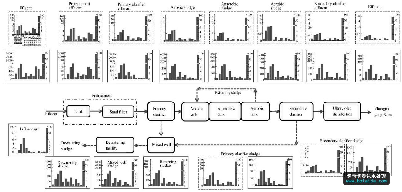 2012年4月份則采集了該廠各個(gè)構(gòu)筑物的出水和污泥樣品,采樣點(diǎn)和類型見圖 1.我們在14: 00—17: 00之間,每個(gè)小時(shí)分別采集該構(gòu)筑物的污水和污泥樣品,然后分別將污水和污泥樣品混合在一起作為一個(gè)混合樣.污水和污泥樣品是分別用干凈的棕色玻璃瓶和廣口瓶采集的,每個(gè)采集瓶上方不留空間,采集完之后立馬放入冰袋中,并運(yùn)到實(shí)驗(yàn)室保存.