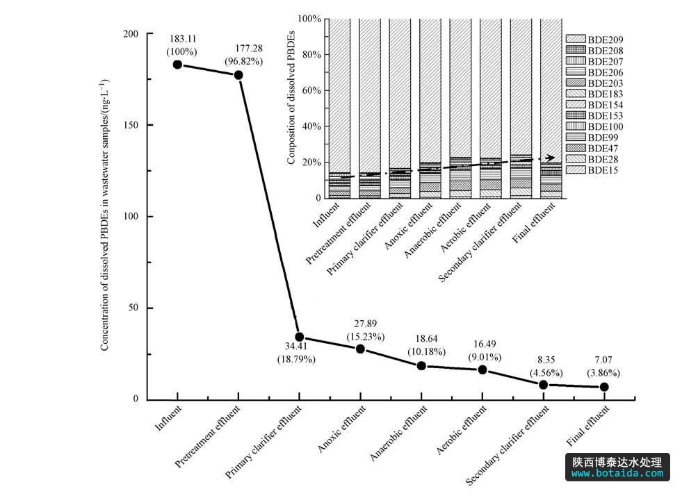 圖2 污水處理流程中溶解態(tài)PBDEs濃度和百分比組成變化