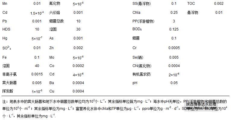 依照國家制訂的地表水環(huán)境質(zhì)量標(biāo)準(zhǔn)(GB3838— 2002)、地下水環(huán)境質(zhì)量標(biāo)準(zhǔn)(GB/14848—1993)、海水環(huán)境質(zhì)量標(biāo)準(zhǔn)(GB3097—1997)、適用于我國湖庫水體的富營養(yǎng)化標(biāo)準(zhǔn)及室外空氣環(huán)境質(zhì)量標(biāo)準(zhǔn)(GB3095—1996)和室內(nèi)空氣質(zhì)量標(biāo)準(zhǔn)(GB/T18883—2002),分別選取了4類水體的95項(xiàng)指標(biāo)(其中,地表水、地下水、海水和富營養(yǎng)化水體分別有24項(xiàng)、33項(xiàng)、23項(xiàng)和15項(xiàng)指標(biāo))和空氣的29項(xiàng)指標(biāo)(其中,室內(nèi)空氣15項(xiàng)指標(biāo)和室外空氣7項(xiàng)指標(biāo)的年、日2種不同分級(jí)標(biāo)準(zhǔn)情形)作為水環(huán)境和空氣環(huán)境的評(píng)價(jià)指標(biāo)體系.
