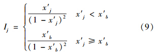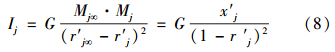 式中,Mj和Mj∞分別為指標(biāo)j的樣本“規(guī)范質(zhì)量”和“參照級(jí)”樣本“規(guī)范質(zhì)量”;r′j為指標(biāo)j的樣本的“規(guī)范坐標(biāo)”,顯然r′j=x′j;G為環(huán)境質(zhì)量引力常數(shù),其取值大小只是為了控制指數(shù)Ij的尺度范圍,對(duì)評(píng)價(jià)結(jié)果無任何影響,為簡單起見,在此取G=1.從而式(8)可表示為: