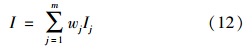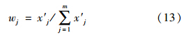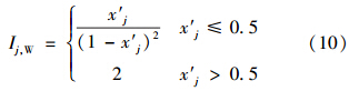 式中,Ij為由式(10)或式(11)計(jì)算得到的指標(biāo)j的引力指數(shù)值;wj為指標(biāo)j的歸一化權(quán)值,即滿足∑ m j=1 wj=1,它可以視實(shí)際問題需要,采用某種方法確定.一般情況下,只要各指標(biāo)的規(guī)范值x′j差異不大,可視各指標(biāo)為等權(quán)即可;但若最大指標(biāo)規(guī)范值x′j,max與最小指標(biāo)規(guī)范值x′j,min差異較大,則可采用如式(13)所示的對(duì)各指標(biāo)規(guī)范值x′j的線性加權(quán)計(jì)算權(quán)值.