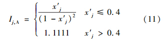 式中,x′j為指標(biāo)j的規(guī)范值;分母中(1- x′j)為環(huán)境樣本到設(shè)定的“參照級(jí)”樣本的規(guī)范距離;Ij為指標(biāo)j的環(huán)境質(zhì)量引力普適指數(shù);x′b為對(duì)不同類型的環(huán)境設(shè)置的指標(biāo)規(guī)范值的閾值.這是因?yàn)橐χ笖?shù)值Ij近似呈規(guī)范值x′j的三次冪增大,為了限制過大的x′j對(duì)綜合引力指數(shù)Ij的影響,而設(shè)置了閾值xb.xb一般設(shè)置為某類環(huán)境最嚴(yán)重污染等級(jí)的所有指標(biāo)規(guī)范值均值 ′j的1.1~1.3倍.因此,對(duì)水質(zhì)指標(biāo)分5級(jí)標(biāo)準(zhǔn),其最嚴(yán)重污染的第5級(jí)標(biāo)準(zhǔn)的所有指標(biāo)規(guī)范值均值 ′j5≈0.45,故取其均值的1.1倍,即取閾值x′b=0.5;而對(duì)空氣指標(biāo)分3級(jí)標(biāo)準(zhǔn),其嚴(yán)重污染的第3級(jí)標(biāo)準(zhǔn)所有指標(biāo)規(guī)范值均值 ′j3≈0.31,近似取其均值的1.3倍,即取閾值x′b=0.4.若污染物濃度的規(guī)范值x′j≥x′jb,則表明其對(duì)環(huán)境污染的危害程度已趨于飽和.從而得到4類水體的任一水質(zhì)指標(biāo)j的規(guī)范值x′j所表征水體樣本與指標(biāo)j的“參照級(jí)”樣本之間的引力指數(shù)公式如式(10)所示.