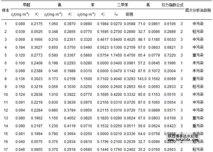 2002年11—12月長春市30個(gè)室內(nèi)樣本5項(xiàng)指標(biāo)監(jiān)測(cè)數(shù)據(jù)cj(湯紅巖等,2005),以及由式(1)和式(7)計(jì)算出的指標(biāo)規(guī)范值x′j如表 11所示.由于樣本1、11~15、26和27的不同指標(biāo)計(jì)算得到的規(guī)范值相差較大,因此,在用式(12)計(jì)算引力綜合指數(shù)時(shí),需用式(13)對(duì)引力指數(shù)值進(jìn)行加權(quán)計(jì)算,其余22個(gè)樣本的指標(biāo)視作等權(quán),計(jì)算得到各樣本引力綜合指數(shù)值,并根據(jù)表 3中空氣環(huán)境質(zhì)量引力指數(shù)分級(jí)標(biāo)準(zhǔn)做出評(píng)價(jià)結(jié)果(表 11).表中還列出文獻(xiàn)(湯紅巖等,2005)中用層次分析評(píng)價(jià)法做出的評(píng)價(jià)結(jié)果.由于文獻(xiàn)(湯紅巖等,2005)中的層次分析評(píng)價(jià)法將室內(nèi)空氣污染劃分為清潔(1*級(jí))、未污染(2*級(jí))、輕污染(3*級(jí))、中污染(4*級(jí))和重污染(5*級(jí))等5級(jí);而本文引力指數(shù)法將其劃分為1級(jí)、2級(jí)、3級(jí).二者對(duì)應(yīng)關(guān)系為:(1*級(jí)清潔、2*級(jí)未污染)對(duì)應(yīng)1級(jí),(3*級(jí)輕污染)對(duì)應(yīng)2級(jí),(4*級(jí)中污染、5*級(jí)重污染)對(duì)應(yīng)3級(jí).由表 11可以看出,二種方法評(píng)價(jià)結(jié)果完全一致.