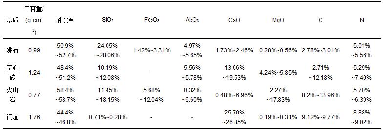 沸石、火山巖購于北京某濾料廠,沸石粒徑2~5 mm,火山巖粒徑2~10 mm.空心磚來自北京某工地,鋼渣來自南昌某鋼廠,研磨過篩后粒徑為2~5 mm.各填料均用清水清洗,并烘干備用.填料干容重與孔隙率采用標(biāo)準(zhǔn)土壤學(xué)方法測定.填料的化學(xué)組成采用X射線能譜儀測定(EX-250,HORIBA公司,日本).4種填料的理化性質(zhì)如表 1所示.