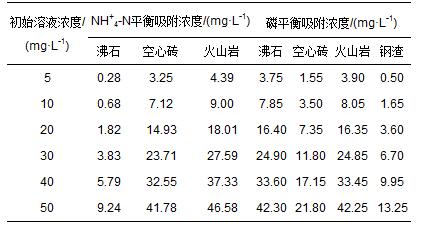 單種填料對溶液中氮、磷的等溫吸附結(jié)果見表 3.由于鋼渣在前期實(shí)驗(yàn)中對NH+4-N基本無吸附,故未在表中列出.如表 3所示,填料的類型影響填料的吸附效果.隨著溶液濃度增加,填料的吸附量也迅速增大,但當(dāng)濃度增大到一定程度后,吸附作用逐漸減弱,吸附作用趨于平衡.