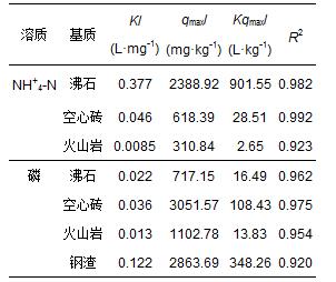 通過Langmuir模型擬合了各基質(zhì)的吸附過程,擬合的相關(guān)參數(shù)如表 4所示.Langmuir模型均能很好地描述各填料的吸附特征.各填料對NH+4-N的飽和吸附量大小為沸石(2388.92 mg · kg-1)>空心磚(618.39 mg · kg-1)>火山巖(310.84 mg · kg-1),沸石的吸附量較大,且遠(yuǎn)大于空心磚與火山巖.對磷的飽和吸附量大小為空心磚(3051.57 mg · kg-1)>鋼渣(2863.69 mg · kg-1)>火山巖(1102.78 mg · kg-1)>沸石(717.15 mg · kg-1),空心磚與鋼渣對磷的吸附量較大.比較表 1中各填料的化學(xué)性質(zhì)也可得出該結(jié)論,空心磚中含有豐富的鈣、鎂元素,鋼渣中含有大量的鈣元素,而游離的鈣、鎂離子能與溶液中的磷酸根形成沉淀,從而使磷得到有效的去除.