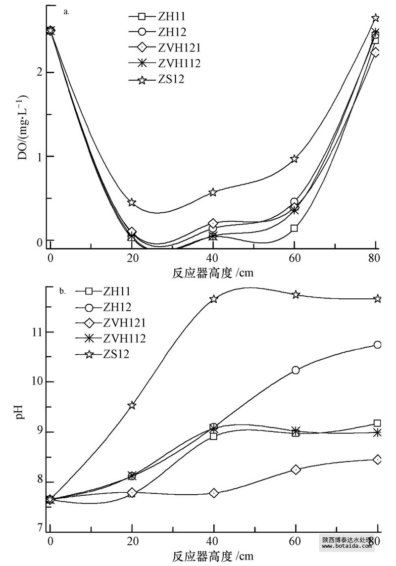 運(yùn)行穩(wěn)定后,反應(yīng)器中不同填料段DO與pH的變化如圖 2所示.DO在各反應(yīng)器分布趨勢基本相似,在各段的數(shù)值上存在差異.DO在不同填料段的濃度具有明顯的空間特征,導(dǎo)致反應(yīng)器在不同段形成了厭氧、缺氧、好氧交替的環(huán)境,這對微生物的生物降解、硝化、反硝化作用具有較大的影響.在各反應(yīng)器底部20 cm處DO濃度均在0.5 mg · L-1以下,ZH11、ZH12、ZVH112、ZVH121的填料組合方式中,底部DO濃度達(dá)到了0.2mg · L-1以下.這說明當(dāng)污水進(jìn)入反應(yīng)器后,DO被迅速消耗,在各反應(yīng)器0~40 cm間形成了一個厭氧環(huán)境.同時隨著反應(yīng)器高度的增加,反應(yīng)器中DO濃度有所升高,在反應(yīng)器頂端接觸空氣處達(dá)到最大值,各反應(yīng)器頂部80 cm處的DO濃度維持在2.24~2.65 mg · L-1之間,這是由于大氣復(fù)氧導(dǎo)致DO濃度的升高.同時,由于該處污水可生化性已經(jīng)較差,污染物不再耗氧分解.
