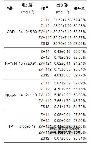 總結(jié)分析各填料組合方式對污染物的去除效果,效果最好的填料組合方式為ZH11,其對COD、NH+4-N、NO-3-N、TP的去除率分別達(dá)到62.40%、95.54%、59.82%和97.50%.