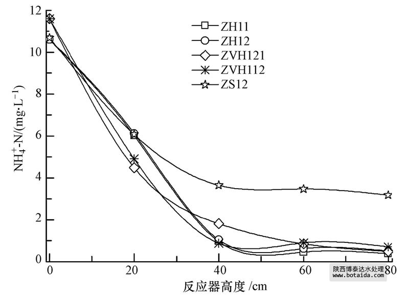 圖 4 NH+4-N隨反應(yīng)器高度的變化