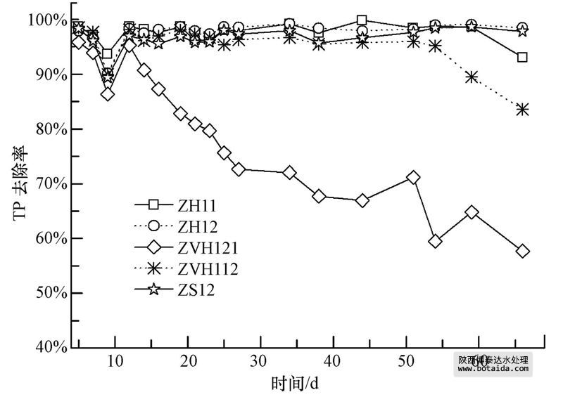 圖 6展示了反應(yīng)器運(yùn)行前70 d,各反應(yīng)器中TP去除率的情況.ZH12、ZH11、ZS12填料組合對磷一直保持著較高的去除率,而ZVH121、ZVH112填料組合在運(yùn)行期間磷去除率的降低,是因?yàn)樵谠摻M合中空心磚含量較少,在反應(yīng)器運(yùn)行一段時間后,反應(yīng)器中的空心磚對磷吸附達(dá)到飽和.含鋼渣的ZS12組合對磷的去除效果穩(wěn)定且較高,但相比較于其他污染物的去除,鋼渣并不適于在人工濕地處理含磷較低廢水的工程中應(yīng)用.而空心磚不僅能有效地去除磷,且對氮的去除無明顯負(fù)作用,適合添加到填料組合中,在不影響其它污染物去除效果的同時,用于提高人工濕地中磷的去除效果.
