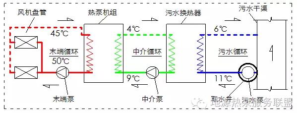 3)最后,45℃左右的末端系統(tǒng)水經末端泵輸送,同樣在配置合理有效狀態(tài)下進入熱泵機組進行換熱,將熱泵機組從低溫那里轉化來的高溫熱量吸收,再以50℃左右進入末端散熱設備將熱量釋放給建筑空間,實現(xiàn)末端循環(huán)。
