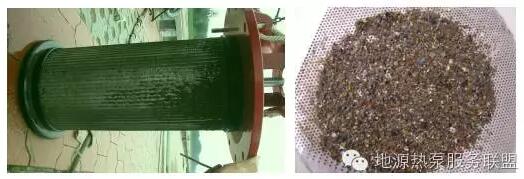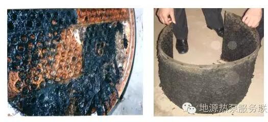 1)防堵塞。未處理原生污水中含有大尺度懸浮物,包括纖維狀的發(fā)絲類、紙屑類、藻狀類,普通的換熱設備是根本無法承受的。而實踐證明:已處理污水和地表水中的懸浮物含量相對較少,盡管與未處理原水不在同一數量級,但隨著運行時間增長,堵塞問題也立即突現(xiàn),原水的堵塞時間為1~3d,而地表水則為7~10d。圖4是未處理原生污水的堵塞現(xiàn)象,圖5是已處理污水的堵塞狀況。