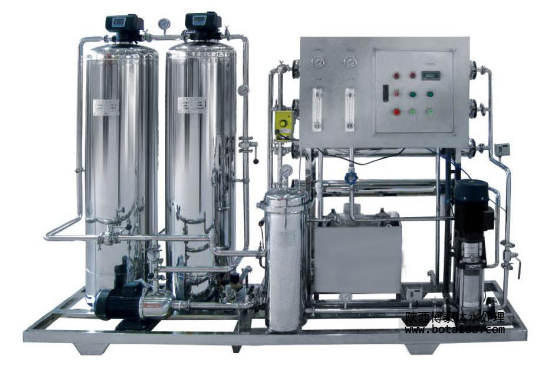 此工藝原理:原水經過精細過濾器、顆?;钚蕴歼^濾器、活性碳過濾器等,再通過泵加壓,利用孔徑為1/10000μm的反滲透膜(RO膜),使較高濃度的水變?yōu)榈蜐舛人?同時將重金屬、細菌、病菌等大量混入水中的雜質全部去除,從而達到飲用規(guī)定的理化指標及衛(wèi)生標準。