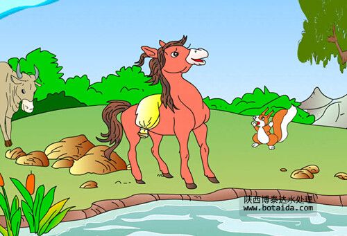 他剛一邁腿,忽然聽見一個(gè)聲音說:“小馬,小馬別下去,這河可深 啦。”小馬低頭一看,原來是小松鼠。小松鼠翹著她的漂亮的尾巴,睜者圓圓的眼睛,很認(rèn)真地說:“前兩天我的一個(gè)伙伴不小心掉進(jìn)了河里,河水就把他卷走了。”小馬一聽沒主意了。