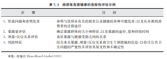 風(fēng)險(xiǎn)評(píng)估、包括QMRA,首先從提出問(wèn)題開(kāi)始,其目的是確定各種可能的危害及危 害從源頭到消費(fèi)者的各種遷移路徑。然后,將人接觸病原體的情況(環(huán)境濃度及攝入 量)和所選(或參考)生物體的劑量 反應(yīng)關(guān)系綜合起來(lái)以描繪出風(fēng)險(xiǎn)的特征。結(jié)合其他 信息(社會(huì)、文化、政治、經(jīng)濟(jì)、環(huán)境等)就可提出一些優(yōu)先選用的管理辦法。為鼓勵(lì)利 益相關(guān)各方的支持和參與,在處理過(guò)程的每一階段,都能做到透明并主動(dòng)溝通有關(guān)危險(xiǎn) 性的信息是非常重要的。表7.3給出了危險(xiǎn)性評(píng)估的一個(gè)例子并在下面進(jìn)行詳細(xì) 描述。