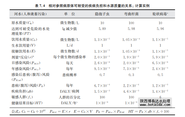 當(dāng)需將一個(gè)病例中發(fā)生特定疾病的風(fēng)險(xiǎn)轉(zhuǎn)化為疾病負(fù)擔(dān)時(shí),可以使用DALY(metric disabilityadjustedlifeyear)(見(jiàn)第3章3.1)。這不但反映了急性終點(diǎn)反應(yīng)(腹瀉),也反映了 死亡率和更嚴(yán)重的終點(diǎn)反應(yīng)(如與彎曲桿菌有關(guān)的格林 巴利綜合癥,即急性感染性多發(fā)神 經(jīng)炎)。每個(gè)病例的疾病負(fù)擔(dān)變化很大。例如,每1000例輪狀病毒的疾病負(fù)擔(dān)在低收入地 區(qū)為480DALYs,而且還經(jīng)常發(fā)生兒童死亡。但在大多數(shù)居民都能得到醫(yī)療救助的高收入 地區(qū)僅為14DALYs/1000例(見(jiàn)附錄1支持性文件《世界衛(wèi)生組織飲用水水質(zhì)準(zhǔn)則中公共 衛(wèi)生風(fēng)險(xiǎn)量化》)。由于這種疾病負(fù)擔(dān)上的明顯差別,為了要達(dá)到相同的危險(xiǎn)程度(以 DALYs/人/年表示),在相同水源質(zhì)量的情況下,在低收入地區(qū)就需要實(shí)施更嚴(yán)格的水處 理。表7.4中10-6DALY/人/年這樣的健康結(jié)果目標(biāo)最好能與具體國(guó)情相結(jié)合。表7.4中 沒(méi)有免疫缺陷人群的計(jì)算數(shù)值(如 HIV/AIDS患者中的隱孢子蟲(chóng)?。?,在某些國(guó)家,這些人群的數(shù)量還是很多的。3.2節(jié)中有更多關(guān)于DALY的信息,及關(guān)于如何將其用于獲取風(fēng)險(xiǎn) 參考值。