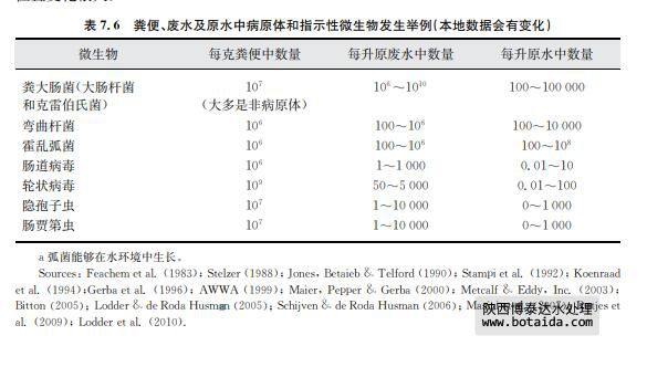 表7.6中,可以清楚地看到糞便指示菌,如大腸桿菌在廢水中常常呈現(xiàn)較高濃度。每個 人都會散布大腸桿菌,但濃度變化很大。只有被感染的人散布病原體,因此,廢水中病原體 濃度變化更大。這樣的變化取決于擴散模式,也依賴于其他因素,如排放廢水的人群規(guī)?;?被其他廢水、如工業(yè)廢水稀釋的規(guī)模。傳統(tǒng)廢水處理在廢水被排放到地表水之前,常常降低 一到兩個數(shù)量級的微生物濃度。在其他地方,原水被直接排放,或者通過排水管溢流偶爾排 放。排放廢水被受納水體稀釋,從而減少了病原體數(shù)量,稀釋因子是因地而異。病原體失 活、死亡或進(jìn)入到沉積物里也會使病原體減少。這些因子隨著表面水體和氣候的不同而變 化。這種變化說明糞便指示菌和病原體的濃度在地表水體比廢水中變化更多。