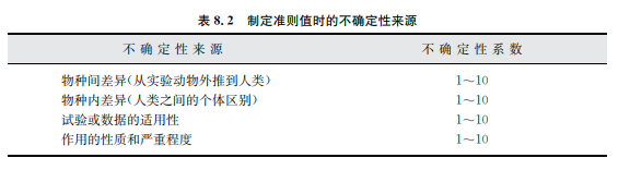 涉及一般人群的接觸劑量時,以動物實(shí)驗(yàn)臨界效應(yīng)得出的犖犗犃犈犔或犅犕犇/犅犕犇犔通 常要除以不確定性系數(shù)100。這里還有兩個10倍系數(shù),其一是物種間差異,另一個是人群中 個體間差異(見表8.2)。另外的不確定性系數(shù)還可能來自數(shù)據(jù)資料的不足和有害作用的嚴(yán) 重性和不可逆性。