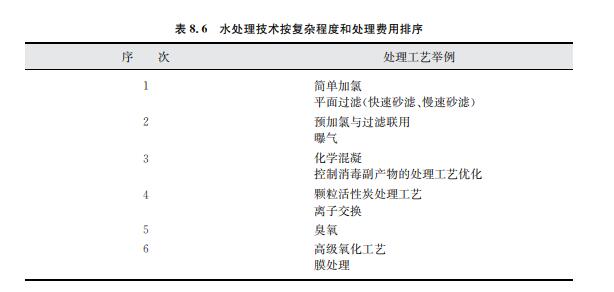 不同水處理工藝按其復(fù)雜程度和處理費(fèi)用的定性排序如表8.6所示,次序越高,工藝或 運(yùn)營(yíng)越復(fù)雜。同時(shí),通常來(lái)說(shuō)也意味著更高的處理費(fèi)用。