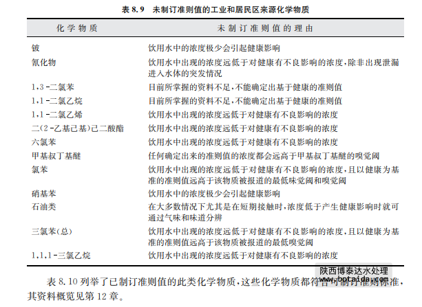 表8.9列舉了尚未制訂準(zhǔn)則值的來(lái)源于工業(yè)和居民區(qū)活動(dòng)的化學(xué)物質(zhì),并在表中說(shuō)明 了理由,其資料概覽見(jiàn)第12章。