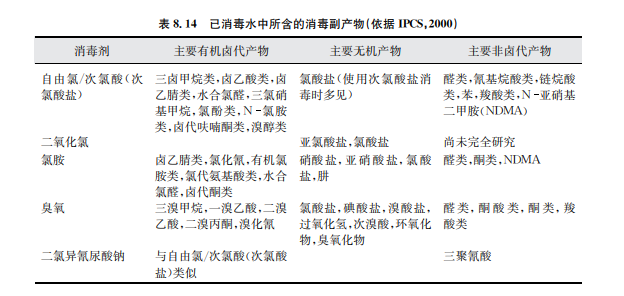 在水處理過(guò)程中,有些物質(zhì)是人為添加進(jìn)入水體的(直接添加物),有些物質(zhì)可能不受控 制地殘留在出水中(如鹽類(lèi)、高分子絮凝劑殘留物或單體)。類(lèi)似氯胺或自由氯的殘留屬于 有意添加,這些殘留對(duì)水質(zhì)保障有一定好處。其他物質(zhì),如消毒副產(chǎn)物,是在消毒劑與水中 通常存在的一些物質(zhì)相互起化學(xué)反應(yīng)過(guò)程中產(chǎn)生的(見(jiàn)表8.14)。氯化消毒副產(chǎn)物和其他消 毒副產(chǎn)物也可能會(huì)在游泳池用水中出現(xiàn),此時(shí)吸入和皮膚吸收途徑對(duì)人體接觸消毒副產(chǎn)物 更加重要(WHO,2006)。