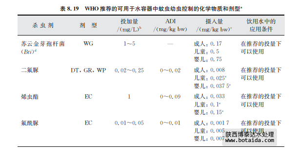 在許多國家,控制以昆蟲為媒介傳播的疾病(如登革熱)非常重要,并且攜菌體(尤其是 蚊子)有機(jī)會(huì)在飲用水的貯藏和采集容器中產(chǎn)卵。盡管必須有防止這些攜菌體進(jìn)入或在這 類容器中產(chǎn)卵的措施,但這種方式不可能完全有效或不能一直有效,在某些情況下就需要使 用蚊蟲幼蟲殺滅劑。