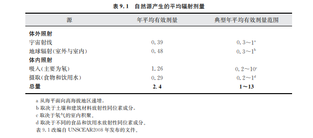 據(jù)聯(lián)合國輻射效應科學委員會估計(UNSCEAR,2008),全球每人接受來自環(huán)境中所有 放射源的年平均劑量約為3.0mSv/年(物理量解釋見專欄9.1)。其中,80%(2.4mSv)來自 自然源,19.6%(接近0.6mSv)來自醫(yī)療診斷輻射,而剩下的0.4%(約0.01mSv)來自于其 他人工源(見圖9.1)。對于整個人群,每個人所接受的輻射劑量變化很大,取決于居住地點、 飲食規(guī)律和生活方式等因素。個人輻射劑量也可能因醫(yī)療暴露和職業(yè)暴露而不同。表9.1 列出了年平均劑量和天然來源個人輻照劑量的典型范圍(UNSCEAR,2008)。