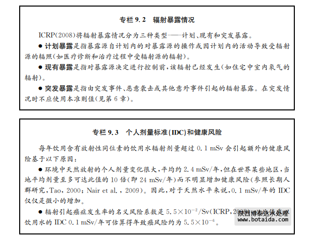 輻射防護(hù)基于任何輻射途徑都會(huì)造成一定風(fēng)險(xiǎn)的假定。在長期時(shí)間內(nèi)攝取含有放射性 同位素的飲用水屬于長時(shí)間輻射暴露的一種。有數(shù)據(jù)表明輻射活度大于100mSv,人類致 癌風(fēng)險(xiǎn)明顯增加(Brenneretal.,2003)。在這個(gè)劑量以下,現(xiàn)有流行病學(xué)研究不足以證明 致癌風(fēng)險(xiǎn)增加。目前,將暴露量和風(fēng)險(xiǎn)假定為線性關(guān)系,且沒有無風(fēng)險(xiǎn)的閾值。由于暴露量 在0.1mSv/年時(shí)不會(huì)造成可檢測到的不良健康效應(yīng),因此將此值設(shè)為個(gè)人劑量標(biāo)準(zhǔn)(IDC)。