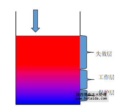 當(dāng)水流首先接觸的上層交換劑失效后,繼續(xù)進(jìn)入的原水就與下一層交換劑進(jìn)行離子交換,從而使工作層不斷下移。整個交換劑層便分為三個區(qū)域。隨著交換劑的運行,失效層的區(qū)域不斷增大,工作層不斷下移,未交換區(qū)域隨之減少。