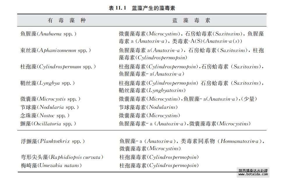 如表11.1所示,許多藍(lán)藻能產(chǎn)生強(qiáng)毒素。在8.5.1.節(jié)中也談到藍(lán)藻毒素。每種毒素都 有其特性,涉及肝損害、神經(jīng)毒性和促癌作用。報(bào)道的急性中毒癥狀有胃腸功能紊亂、發(fā)熱 和皮膚、耳、眼、咽喉、呼吸道刺激。藍(lán)藻在人體內(nèi)不能增殖,因此沒有感染性。