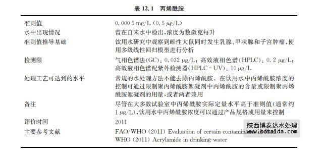 用聚丙烯酰胺絮凝劑處理飲用水時會造成丙烯酰胺單體的殘留(見表12.1)。通常,水 中該聚合物的最大允許用量為1mg/L。當聚合物中單體的含量占0.05%時,水中相對應的單體最大的理論濃度相當于0.5μg/L。實際使用中,濃度可能比上述還要低2~3倍。這個 濃度適用于陰離子和非離子聚丙烯酰胺,而陽離子聚丙烯酰胺中單體的殘留水平可能會高 些。聚丙烯酰胺還可以用作建造飲用水蓄水池和水井的灌漿劑。人對其的攝入源于食物的 可能性多于源于飲用水:由于食物加工過程使用聚丙烯酰胺,而高溫烹調食物(例如面包、 油炸的和烤的食物)可能生成丙烯酰胺單體。