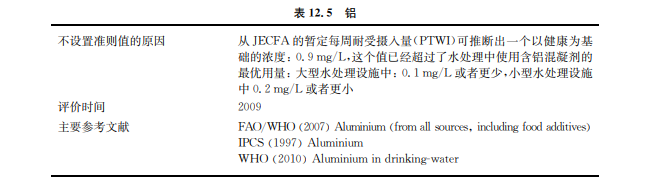 盡管鋁廣泛存在于食物、飲用水及抗酸劑中,很少有跡象表明經(jīng)口攝入鋁會(huì)引起人急性 中毒。有一種假設(shè)認(rèn)為鋁的攝入會(huì)增加人類(lèi)老年癡呆癥發(fā)病風(fēng)險(xiǎn)。1997年 WHO發(fā)布的 環(huán)境健康標(biāo)準(zhǔn)中對(duì)鋁作出規(guī)定(見(jiàn)表12.5)。