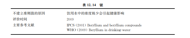 水中的鈹化合物主要來(lái)源于煤礦燃燒和其他使用鈹?shù)墓I(yè)釋放。地表水中鈹?shù)钠渌麃?lái) 源包括大氣中鈹?shù)某练e和含有鈹?shù)膸r石和土壤的風(fēng)化作用。鈹在自然水體中大多數(shù)情況都 在痕量水平(見(jiàn)表12.14)。鈹氧化物及氫氧化物在正常pH值范圍內(nèi)難溶于水.