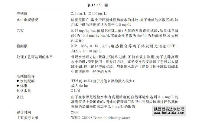 硼的化合物可用于制造玻璃、肥皂和清潔劑,并可用作阻燃劑。地下水中硼的天然來(lái)源 主要是由于含有硼酸鹽和硼硅酸鹽的巖石或土壤的浸出。地表水中硼含量會(huì)由于污水的排 入而增加,但這種作用的排污量以及污水中硼的平均含量已經(jīng)明顯減少(見(jiàn)表12.15)。