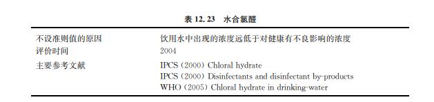 水合氯醛或者三氯乙醛是當(dāng)水中含有有機(jī)前體物(如富里酸和腐殖酸)時(shí),生成的氯 化消毒副產(chǎn)物(見表12.23)。有研究發(fā)現(xiàn)它在飲用水中的濃度可高達(dá)100μg/L,但是通 常濃度低于10μg/L。一般地表水中的濃度高于地下水,其濃度在水的輸送過(guò)程中可能會(huì) 增高。
