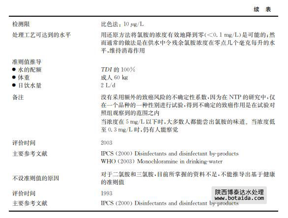 2)二氯胺和三氯胺 二氯胺和三氯胺沒(méi)有被廣泛研究,兩者現(xiàn)有的研究資料均不足以推導(dǎo)基于健康的準(zhǔn)則 值。不過(guò),如果氯胺的含量沒(méi)有控制得當(dāng),這些化合物會(huì)造成水的味道與氣味問(wèn)題(詳見(jiàn)第 10章)。