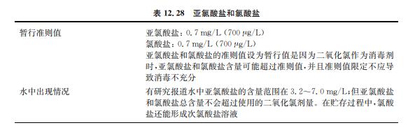 亞氯酸鹽和氯酸鹽是使用二氧化氯作為消毒劑或用于去除水中嗅味和異味的副產(chǎn)物 (見表12.28)。二氧化氯同時也用作纖維、紙漿、面粉和油類的漂白劑。亞氯酸鈉和氯酸鈉 用于制備二氧化氯以及其他商業(yè)用途。飲用水出水中,二氧化氯迅速分解成亞氯酸鹽、氯酸 鹽和氯化物離子,其中亞氯酸鹽是主要成分,該反應在堿性條件下容易進行。飲用水是接觸 環(huán)境中二氧化氯、亞氯酸鈉和氯酸鈉的主要途徑。氯酸鹽也會在儲存很久的次氯酸鈉溶液 中生成,特別是在高溫環(huán)境下。