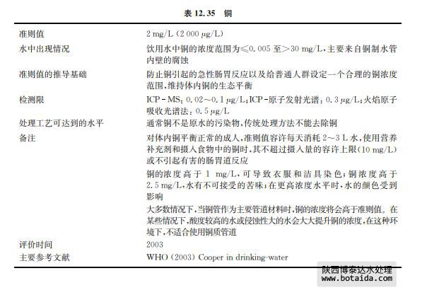 銅既是基本營(yíng)養(yǎng)元素,又是飲用水的污染物(見表12.35)。銅可用于制造管件、閥門和 配件,還可用于合成合金和鍍層。五水硫酸銅化合物有時(shí)會(huì)用于地表水中的藻類控制。飲 用水中銅的濃度范圍很廣。大多數(shù)情況,其主要來自銅制水管內(nèi)部的腐蝕。不過不斷流動(dòng) 的水或有壓流的水中銅的濃度往往較低。反之,在靜止的水或部分流動(dòng)水中銅的濃度變化 很大,最高濃度較高(經(jīng)常高于1mg/L)。在水輸送過程中,特別是輸水系統(tǒng)中處理過的水 呈酸性或含高濃度碳酸鹽而呈堿性的水中,往往會(huì)使銅的溶解增加,濃度升高。發(fā)達(dá)國(guó)家中, 食物和水是銅的主要暴露源。在使用裝有銅水管或接頭的管網(wǎng)系統(tǒng)中,水流經(jīng)常靜止或部分 流動(dòng)條件下,可以大大增加每日銅的攝入量,特別是嬰兒人工喂奶時(shí)用自來水調(diào)配的奶。