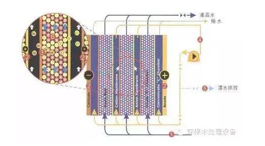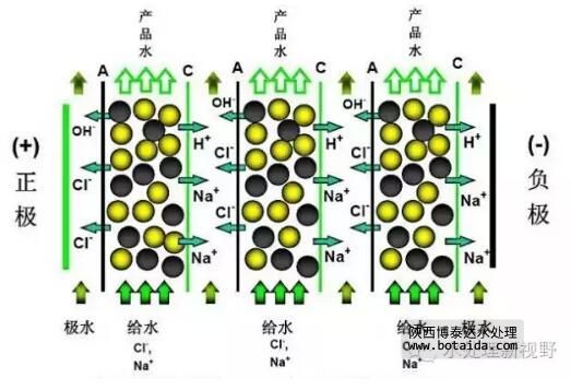 EDI膜堆主要由交替排列的陽(yáng)離子交換膜、濃水室、陰離子交換膜、淡水室和正、負(fù)電極組成。離子交換樹(shù)脂充夾在陰陽(yáng)離子交換膜之間形成單個(gè)處理單元,并構(gòu)成淡水室,單元與單元之間用網(wǎng)狀物隔開(kāi),形成濃水室。在直流電場(chǎng)的作用下,淡水室中離子交換樹(shù)脂中的陽(yáng)離子和陰離子沿樹(shù)脂和膜構(gòu)成的通道分別向負(fù)極和正極方向遷移,陽(yáng)離子透過(guò)陽(yáng)離子交換膜,陰離子透過(guò)陰離子交換膜,分別進(jìn)入濃水室形成濃水。同時(shí)EDI進(jìn)水中的陽(yáng)離子和陰離子跟離子交換樹(shù)脂中的氫離子和氫氧根離子交換,形成超純水(高純水)。超極限電流使水電解產(chǎn)生的大量氫離子和氫氧根離子對(duì)離子交換樹(shù)脂進(jìn)行連續(xù)的再生。傳統(tǒng)的離子交換,離子交換樹(shù)脂飽和后需要化學(xué)間歇再生。而EDI膜堆中的樹(shù)脂通過(guò)水的電解連續(xù)再生,工作是連續(xù)的,不需要酸堿化學(xué)再生。