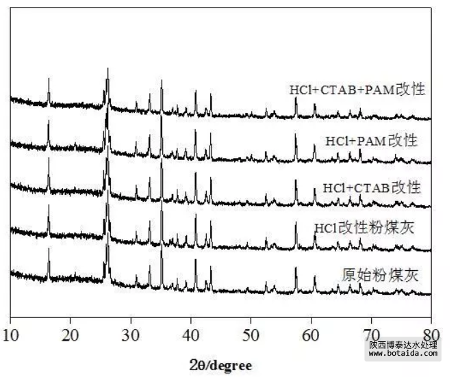 上圖為原始粉煤灰及改性粉煤灰的XRD譜圖。由圖可知,原始粉煤灰的X射線衍射譜圖與經(jīng)過改性的粉煤灰的X射線衍射譜圖相比,特征峰位置基本不變,這與粉煤灰是在高溫下形成的有很大關(guān)系,其在高溫下形成玻璃體結(jié)構(gòu)和組成成分很難改變。SiO2的特征衍射峰在26°附近,Al2O3的特征衍射峰在43°附近,Ca(OH)2的特征衍射峰在32°附近,峰面積與其含量有關(guān),含量越高,峰面積越大。由圖可知,SiO2的特征峰基本不變,說明粉煤灰的基本玻璃體結(jié)構(gòu)大部分未被破壞。Al2O3和Ca(OH)2的特征衍射峰值略微減少,說明HCl改性使其溶出,增大了粉煤灰的表面粗糙度,增加了吸附位點,這與SEM圖表征結(jié)果一致。粉煤灰中玻璃體的含量可以由XRD圖譜上有許多分散的細(xì)小峰包的峰面積和峰范圍大小相對表示,由圖可得,粉煤灰的衍射強度降低,改性粉煤灰的峰包面積小于原始粉煤灰,說明改性過后的玻璃體結(jié)構(gòu)部分被破壞。
